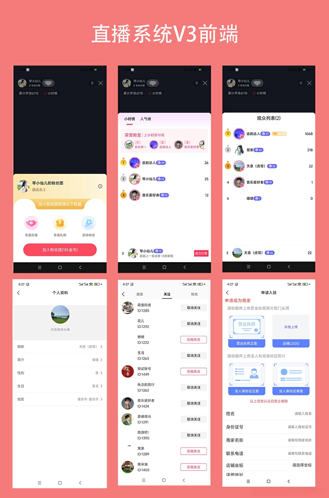 - 直播列表:以列表形式展示直播内容,点击即可进入直播间。直播间功能:显示主播关注状态及排名。观众列表展示前100名用户。直播间模板参考主流直播平台设计。直播间人数可后台调控。粉丝灯牌:完成任务提升亲密值。粉丝灯牌等级制度,随等级解锁专属礼物。粉丝群功能暂未开放。榜单:小时榜、荣誉殿堂、前100榜单。财富等级标志及颜色区分。用户头像展示开播信息,支持额外收费功能。声浪:实时显示直播间总收入。分享功能:支持生成二维码邀请好友下载,通过剪切板绑定上下级关系。礼物系统:刷礼物提升用户等级,等级规则明确说明。充值功能,显示抖金币余额。礼物分类:推荐礼物、红包、粉丝团专属礼物(随等级解锁)。小黄车:粉丝数达到1000后自动开启,支持商品橱窗功能。互动功能:支持分享、举报。评论功能。任务系统:发布短视频、完成直播间灯牌任务(如亮灯牌并停留3分钟)可获得抖金币奖励。打赏分成:后台可调控直播打赏分成比例。特效功能:小礼物特效展示(暂不支持叠加)。高等级用户入场特效。跳转功能:支持在直播间内点击进入其他用户直播间。