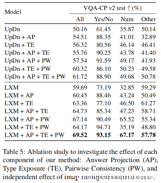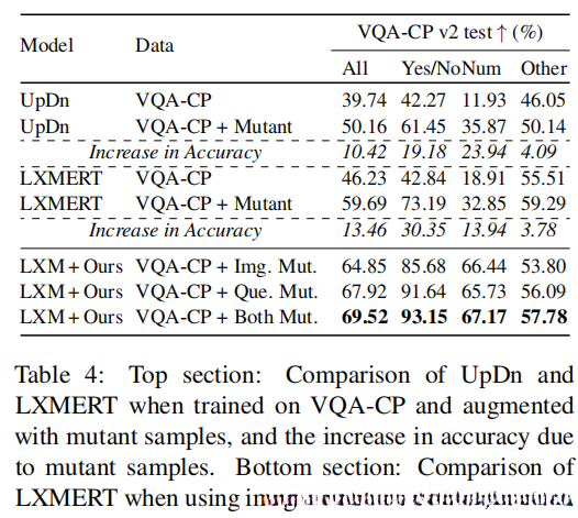 (1)使用突变体样本进行训练的影响:我们衡量了用突变样本增加训练数据对UpDn和LXMERT的影响,结果如表4,总体性能均有改善,对于yes-no和计数类的模型表现有显著的跳跃,UpDn在数字问题上尤其受益于突变体样本(提高了23.94%)。