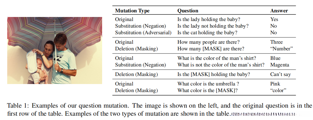 使用三种问题突变,如表1.首先识别关键对象,然后应用基于模板的问题操作符。第一个操作符是对yes-no问题的否定,通过一个基于模板的过程来实现的,在动词、借此或名词短语前添加一个no或not。第二种是使用翻译词或敌对的对象词来代替关键词。第三种掩盖问题中的单词,从而引入问题中的歧义。不能确定的识别新答案的问题通过一个广泛的类标签注释(color,location,fruit而不是red,library,apple)。然而我们希望模型能够在部分封闭的输入下识别这个广泛的答案类别。对于具有非关键对象或单词的突变,答案保持不变。