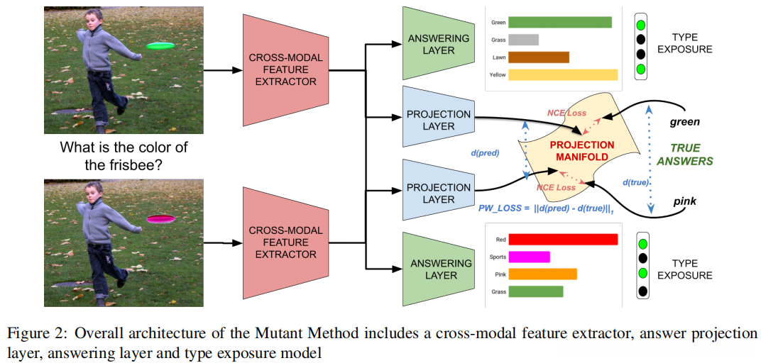 我们提出了一种问题类型的暴露框架,教模型,尽管这些语言先验可能存在于训练数据中,其它运动也可以回答这些问题,从而减轻负面偏见。这与专注于使用数据增强减轻语言偏见的方法(CSS)相反。我们的方法使用成对训练协议,以确保原始样本和突变样本的答案预测的一致性。我们的模型包括一个投影层,投影了跨模态特征和学习流形的真实答案,并使用噪声对比估计损失来最小化两个向量间的距离。