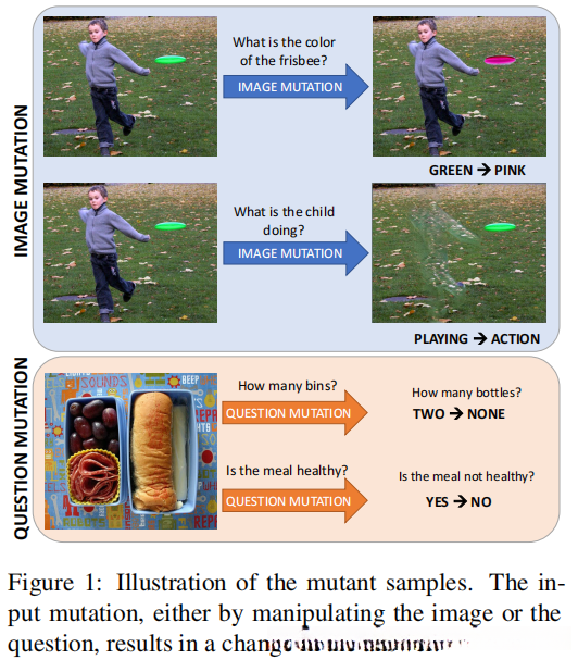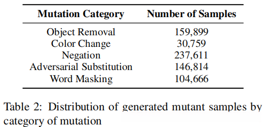 有三种转换创建突变输入,添加、删除、或替换。对于图像突变,对应于对象的添加或删除,改变对象的属性,如颜色、纹理、和照明条件。问题突变可以通过添加一个负面词(no,not等),掩盖关键词,用反义词代替目标词。因此,对于VQA数据集中的每个样本,我们可以获得一个突变样本并用于训练。