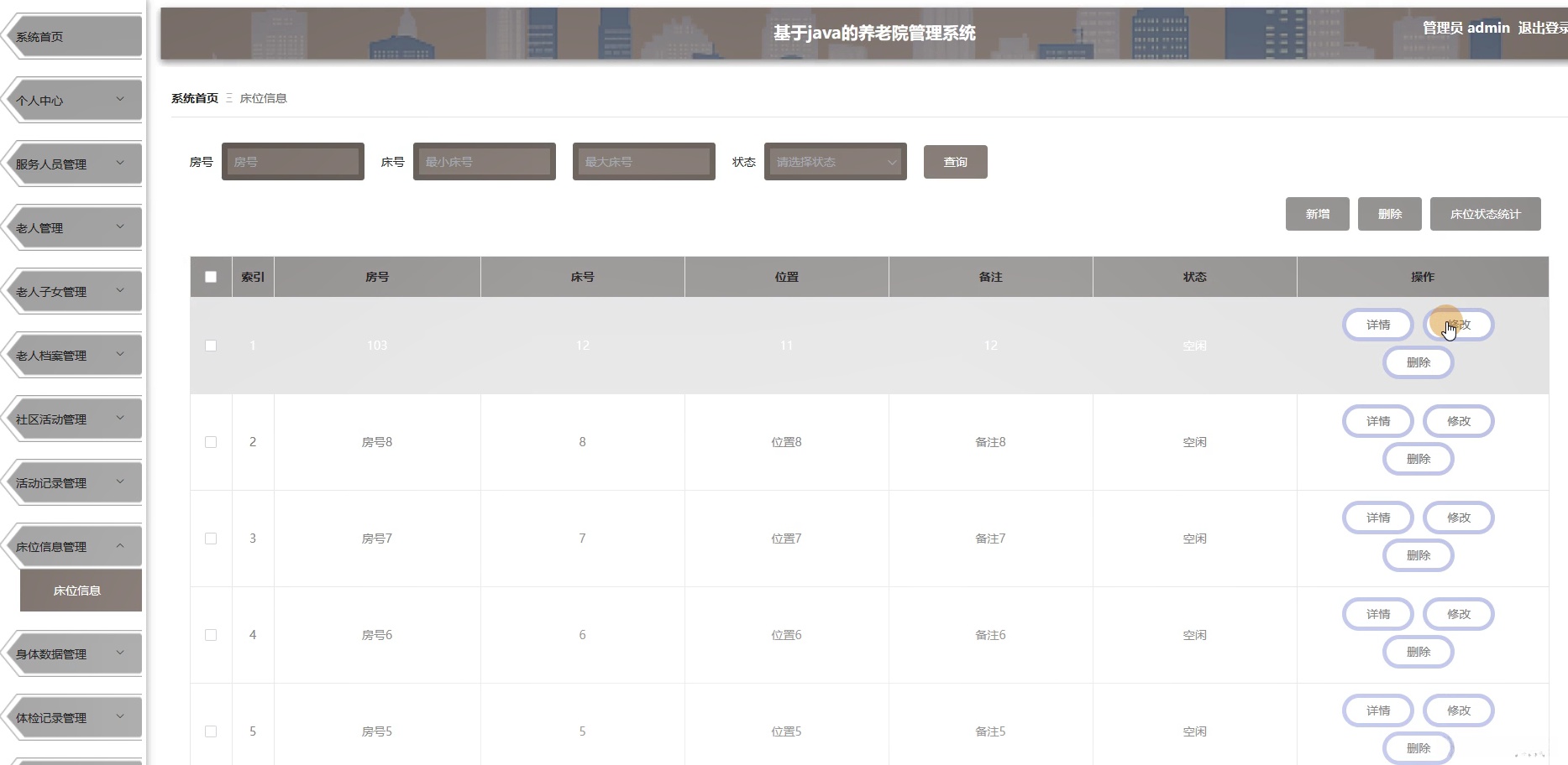 管理员点击床位信息管理,在床位信息管理页面中可以对房号、床号、位置、备注、状态 等信息,并可根据需要进行查询、新增或者删除床位信息等操作,如图5-12所示。