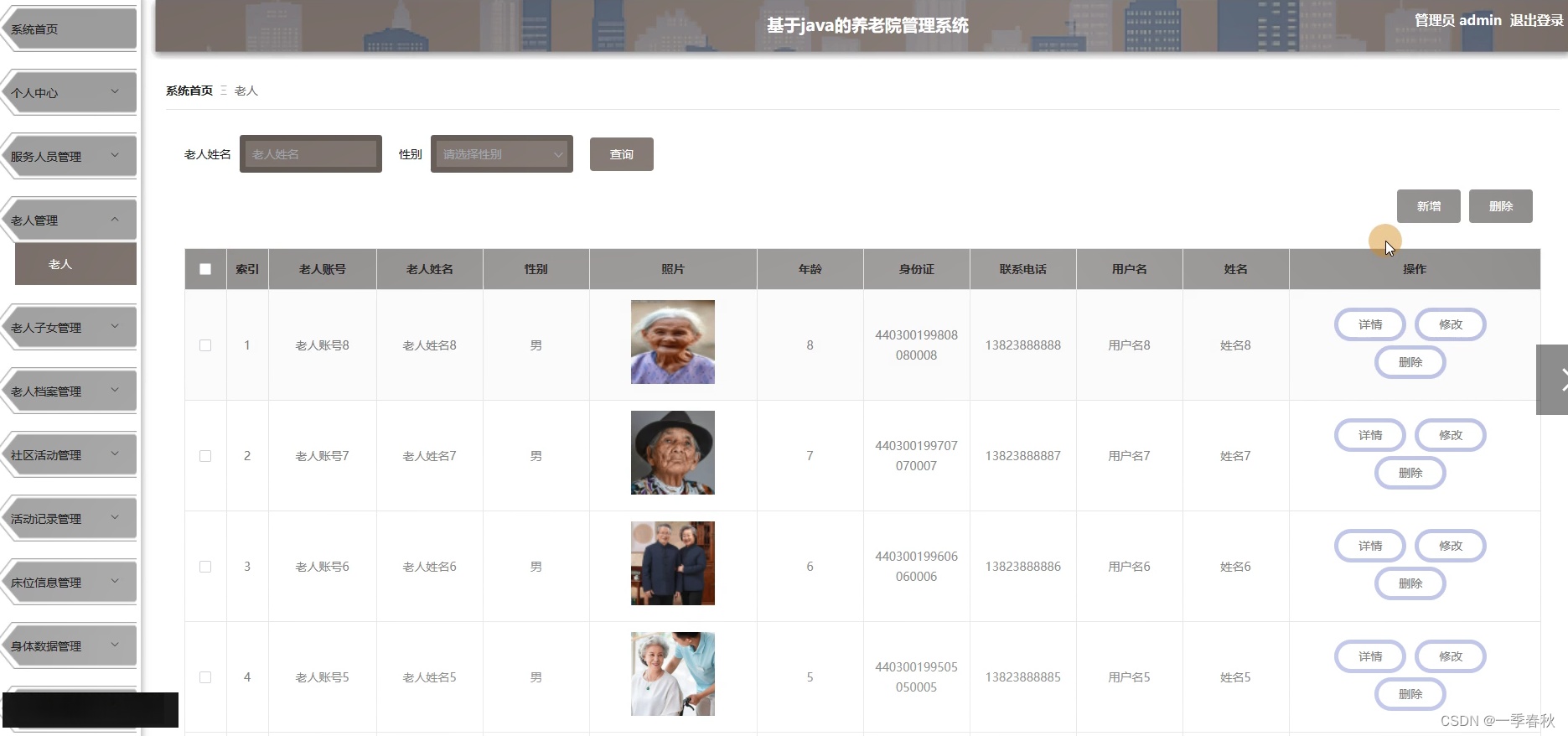 管理员点击老人管理,在老人管理页面中可以对老人账号、老人姓名、性别、照片、年龄、身份证、联系电话、用户名、姓名等信息,并可根据需要进行查询或者新增、删除老人信息等操作,如图5-8所示。