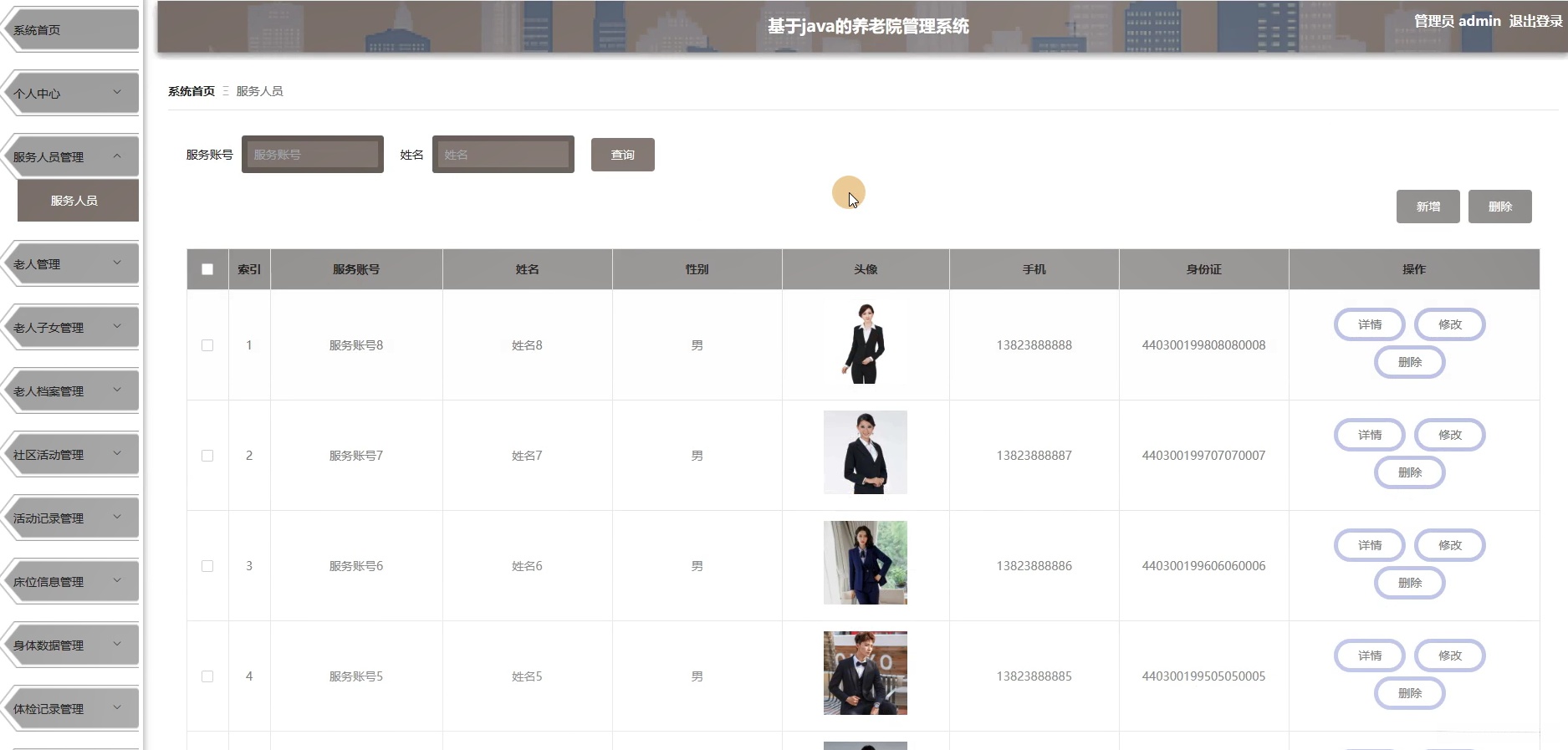 管理员点击服务人员管理,在服务人员管理页面中可以对服务账号、姓名、性别、头像、手机、身份证等信息,并可根据需要进行查询或者新增、删除服务人员信息等操作,如图5-7所示。