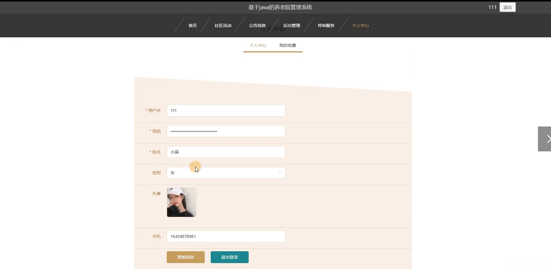 在个人中心页面可以输入个人详细信息,进行信息更新操作,还可以对我的收藏进行详细操作,如图5-4所示: