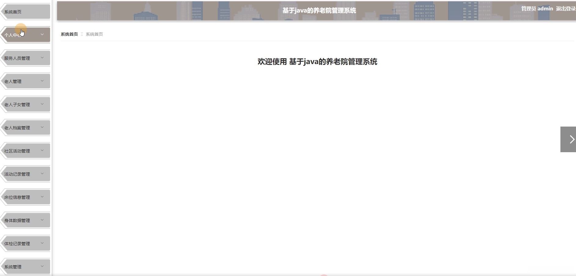 管理员登录进入养老院管理系统可以对系统首页、个人中心、服务人员管理、老人管理、老人子女管理、老人档案管理、社区活动管理、活动记录管理、床位信息管理、身体数据管理、体检记录管理、系统管理等功能,进行详细操作,如图5-6所示。