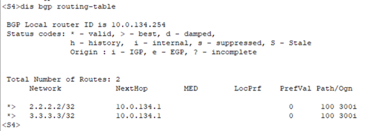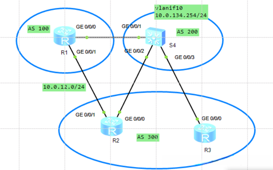 S4的G0/0/1、G0/0/2、G0/0/3属于VLAN 10;S4与R1、R1与R2通过直连接口建立EBGP邻居关系;R2与R3通过物理接口建立IBGP邻居关系;R2和R3的回环口在AS300中进行通告;