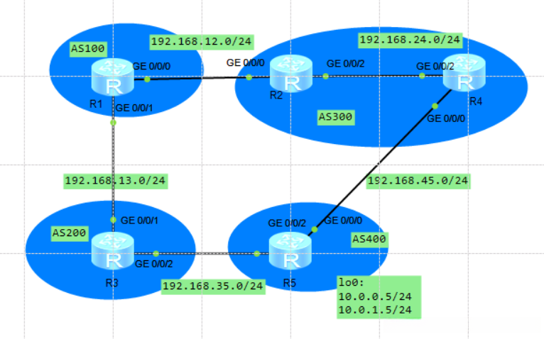 R5与R3和R4建立EBGP邻居关系,R5通告10.0.X.0/24,将传递给AS 300的路由10.0.0.0/24标记community为400:1;其他各相连路由器间建立BGP邻居关系;路由10.0.0.0/24不能穿越AS 300且R4需继承原有的community属性,禁用过滤,在R4上操作;AS 100和AS 200访问网络10.0.1.0/24时,优选经过AS 300的路径。