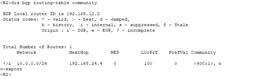 配置完成后,R2上的10.0.0.0的community属性增加了no-export,而且R1上的10.0.0.0/24这个路由条目下一跳变成只有R3的地址: