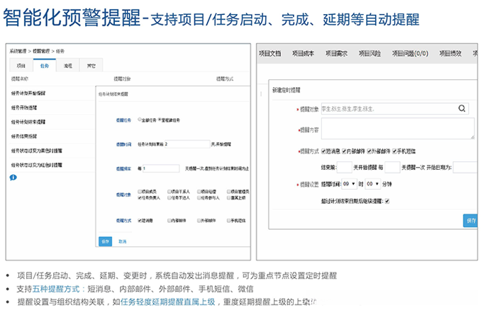 航空航天项目研制所涉及的部门比较多,而且其技术也相对较为复杂,产品的研制周期都比较长。针对航空航天项目研制过程中可能出现的周期延长、研制费用膨胀、技术指标达不到设计要求等问题,捷为科技iMIS-PM集成项目系统对项目整个生命周期过程中的各种风险进行识别,创建风险,制定风险响应计划和跟踪。同时,捷为科技iMIS-PM集成项目系统配置有智能化预警提醒功能。在项目启动和执行过程中,项目/任务状态变更、延期和重要时间节点,成本偏差,技术偏差,系统可根据设置自动推送提醒消息。提醒设置可与组织结构关联,如任务轻度延期提醒直属上级,重度延期提醒上级的上级。