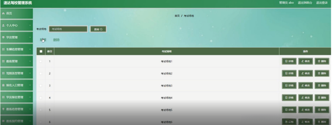 考试场地管理模块:在该模块中设置和维护考试场地信息相关数据内容,在线完成新增、增删操作,并支持后台人员查看相关数据记录情况,请参考系统界面设计说明中的相关内容(见图5-9)。
