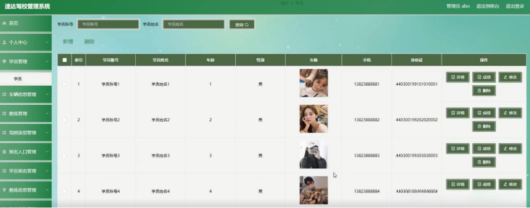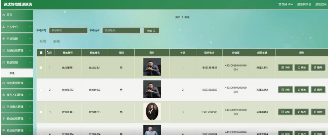 教练管理:通过 coach management interface to review coach account information including coach name, gender, photo, age, phone number, ID card number, vehicle registration details. 同时能够进行 coach detail review, modifications or deletions as needed. 如图5-5所示。