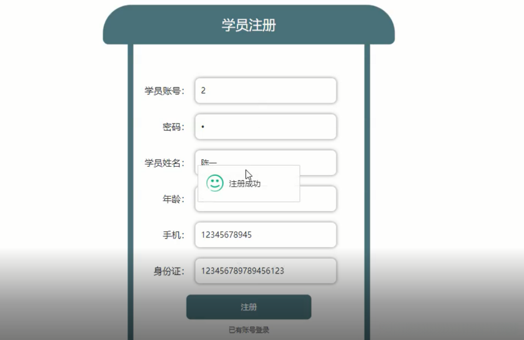 学员完成注册与登录流程,在注册页面详细填写必要的个人信息(如账号、密码、姓名、年龄、手机和身份证号)后进行注册。系统将显示相应的错误提示信息(如有)。所有信息正确无误后进入登录页面进行验证。