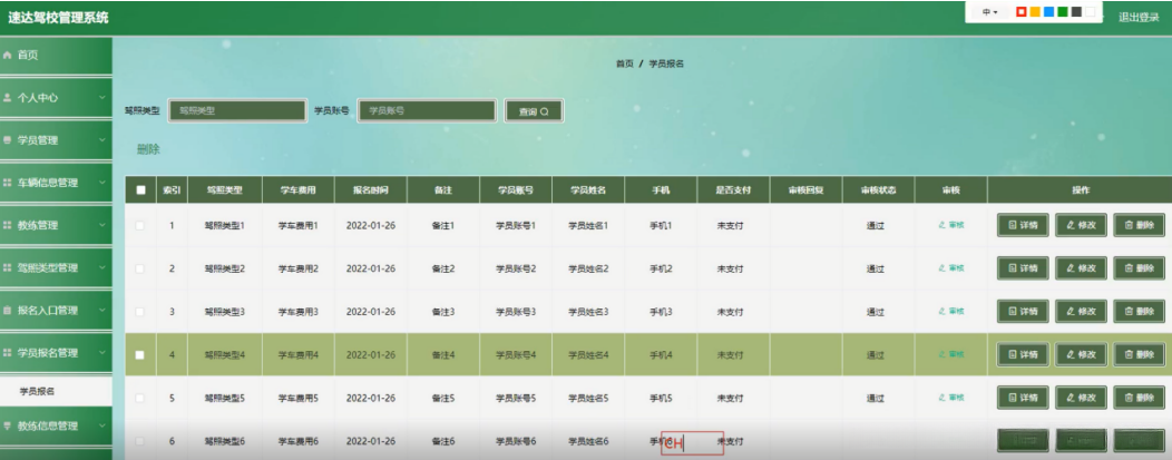 学员报名管理:在学员报名管理模块中,管理员可浏览各类考试科目和驾驶费用信息,并查看学车时间安排表以及个人备注内容等信息。具体包括学员账号对应的信息如姓名和联系方式等基础资料信息以及支付状态等信息,并根据系统提示对相关操作进行处理。如图 5-8所示。