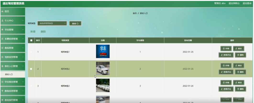 报名入口管理系统:系统管理员通过该系统模块执行操作。系统管理员利用报名入口管理模块查询驾照类型、封面信息以及学车费用等详细内容,并可执行更新或删除操作。