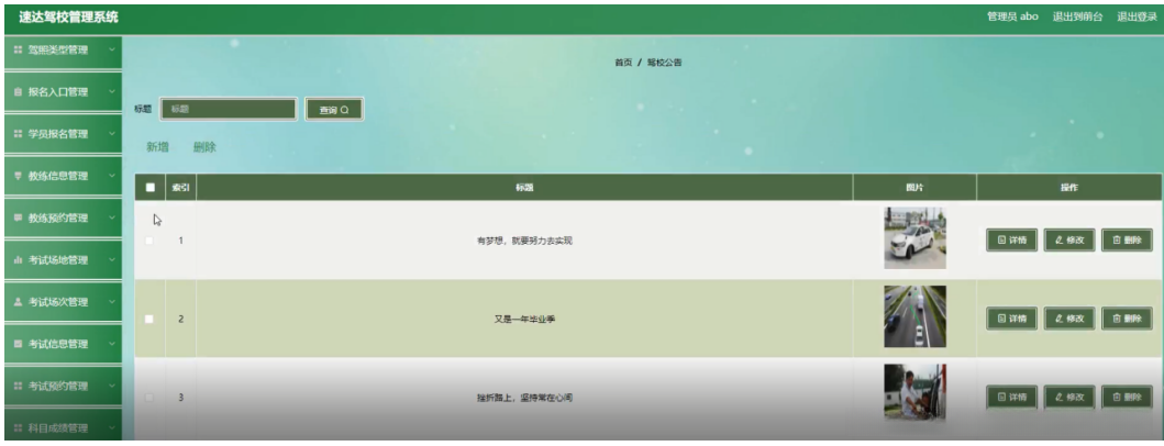 系统管理模块中,管理员后台可在该页面上操作:包括新增驾校公告内容及图片资料,并发起信息发布;执行图片上载处理及信息反馈处理;同时支持新增/删除/修改以及查看功能项,并确保系统的稳定运行。如图5-11至5-13所示