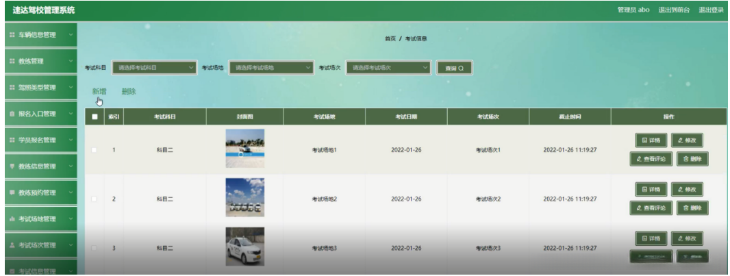 系统管理员通过考试信息管理模块查看包含在该页面中的考试科目、封面图以及与之相关的其他信息(包括但不限于):考场地点、开考时间、考场人数上限等,并对这些信息进行相应的修改或删除操作。如图5-10所示