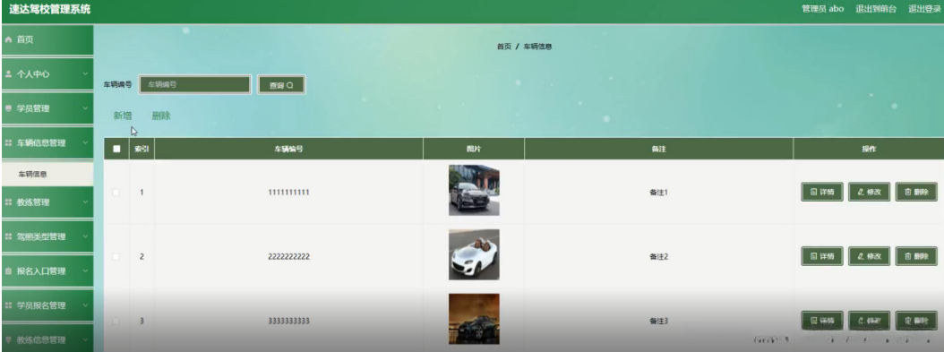 车辆信息管理:管理员在车辆信息管理页面中浏览车辆编号、图片和备注等详细信息,并进行详情查看、修改或删除等操作(如图5-6所示)。