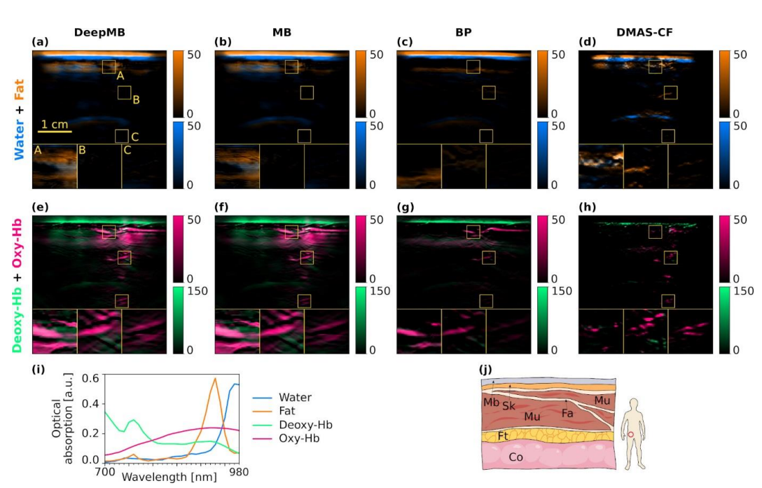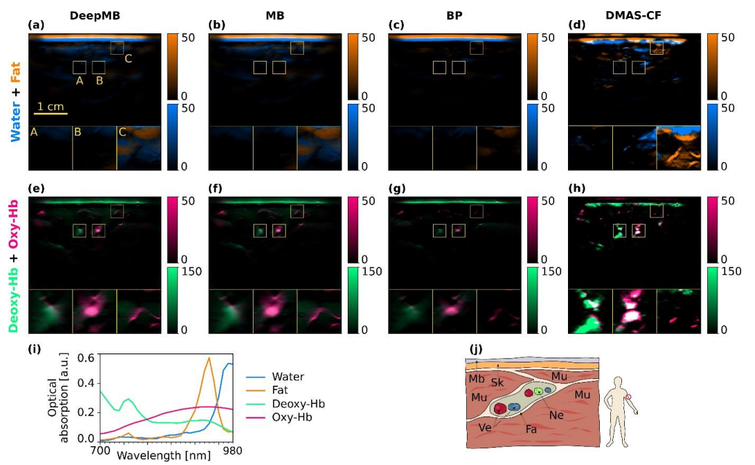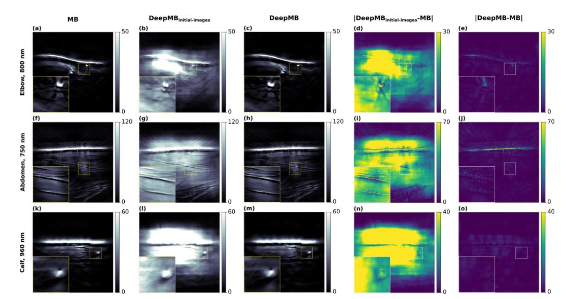- 这些研究结果不仅证明了 DeepMB 在单波长成像上的卓越性能,而且其强大的多光谱成像能力非常适合临床应用,能够有效提供高质量的影像数据。