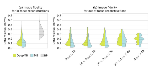 图3比较了基于深度模型基础(DeepMB)、模型基础(MB)以及反投影(BP)方法所重建的光声图像在数据残差范数上的表现。(a)基于最佳声速(SoS)值构建的聚焦图像在数据残差范数上覆盖了体内测试集中的全部4814个样本。(b)基于次优 SoS 值重构的焦点外区域的数据残差范数涉及一个包含638个样本的子集。通过逐步增加10米/秒的ΔSoS增量来评估SoS不匹配程度的变化情况,五个子图清晰地展示了这一过程。