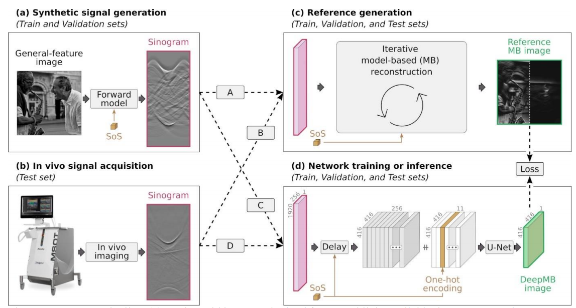 如图所示的流程图1展示了DeepMB系统的整体架构设计。(a)系统首先从公开可用的数据集中获取真实世界图像样本,并通过物理前向模型生成模拟正弦波形图。(b)随后从六位参与者身上采集不同解剖位置的体内正弦波形数据。(c)为了构建高质量的数据集以供模型训练使用,在合成数据集(A)和体内数据集(B)之间建立起了相互关联的关系体系。(d)系统通过迭代重建算法生成高质量的目标参考图像并完成数据增强处理过程。(E)最终系统利用改进后的训练集、验证集和测试集完成了深度学习模型的参数优化任务。(F)其中关键的技术环节包括:首先通过对输入正弦波形应用时滞操作来进行域转换;其次对SoS进行单精度编码并作为额外通道连接;最后采用U-Net卷积神经网络对多通道信号进行深度学习建模。(G)在整个训练过程中采用均方误差作为损失函数来衡量网络输出与参考图像之间的差异程度。(有关详细的设计原理和技术实现,请参阅"方法/架构设计"部分)