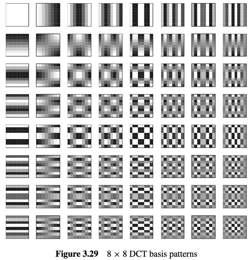 信不信由你,任意一张8*8的图,都可以由标准图中的的小图以一定比例叠加而合成,而每个小图的权重,由DCT变换得到的矩阵决定,是不是很有意思。DCT变换后左上角一般是比较大的数字,而右下角一般是比较小的数字,这暗含了图片中低频信息占的比重较多,因此我们在做图片或者视频编码压缩的时候,正是通过量化舍弃右下角的高频信息,来实现信息的压缩。