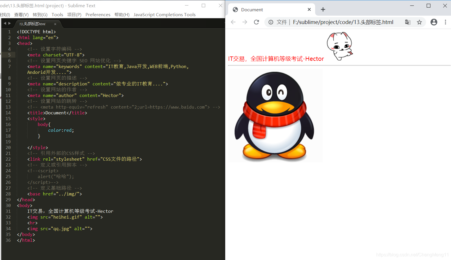 <html>作为主标签包含<head>标头和<body>主体内容; - 标头部分提供网页相关信息,包括标题、文档类型、字符编码等摘要信息;