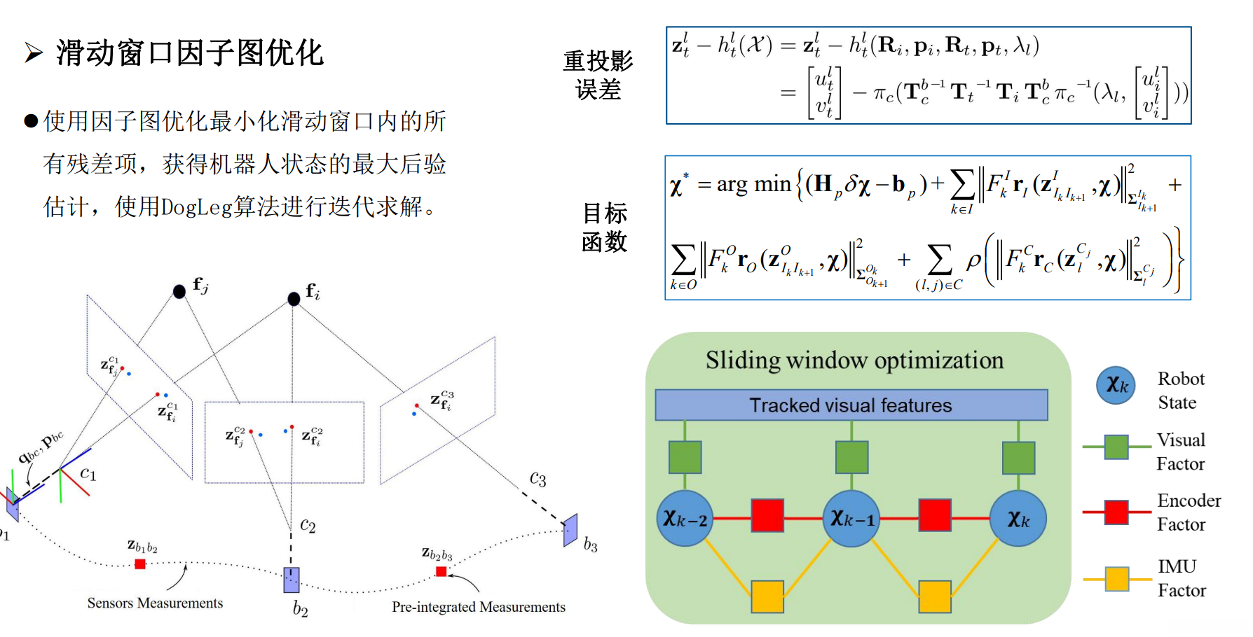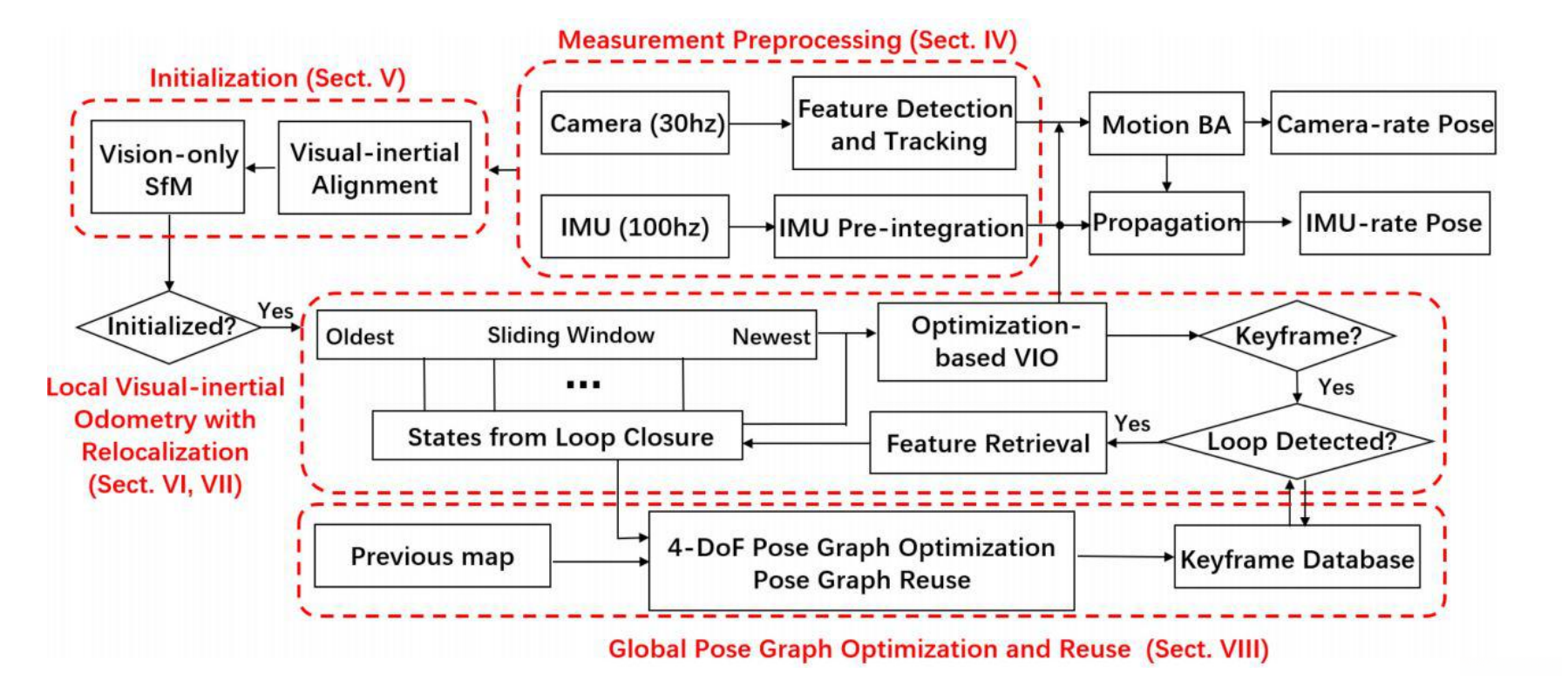 中间的框(Sect. IV)是传感器的测量:视觉特征的提取(FAST角点、用光流法进行跟踪匹配)、IMU预积分。