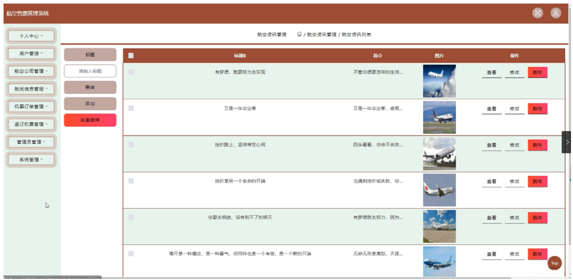 系统管理,在航空资讯页面上可以查看、修改或删除标题、简介以及图片等内容,并且还支持在线咨询以及轮播图的管理都可实行详细的操作管控;如图5-11所示。