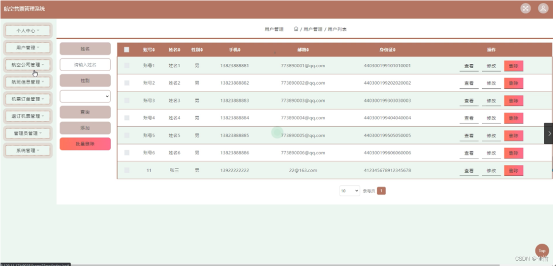 用户管理系统,在用户的登录页面中能够实现账号、姓名、性别信息、手机号码、电子邮箱以及身份证号码等信息的显示、更新和删除操作。如图5-6所示。