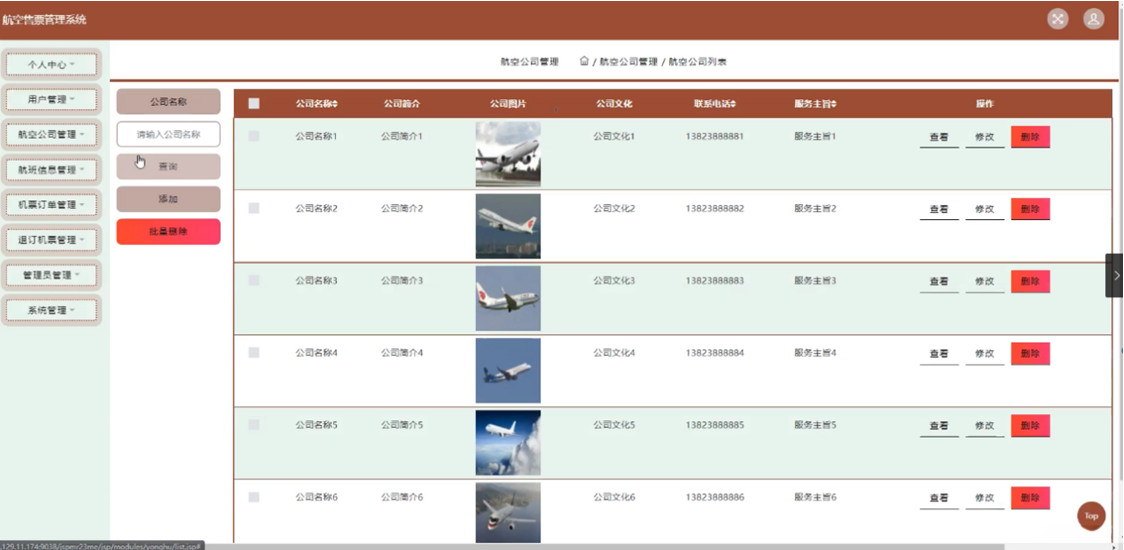 航空公司的管理中,在航空公司的管理页面上(即航空公司的管理系统中),我们可以对这些信息进行查看(获取)、修改和删除等操作(即增删改查)。这些信息包括公司名称、公司简介、公司图片、公司文化以及联系电话和服务主管的相关内容。
