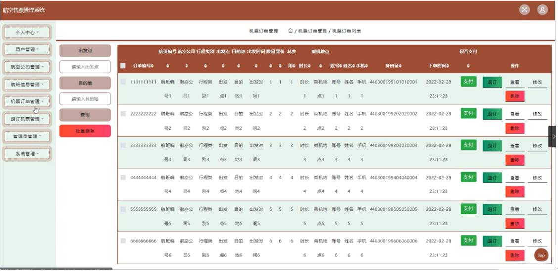 在该页面中对订单编号、航班编号、航空公司、行程类别、出发点、目的地、出发时间、数量、票价等项目进行支付、退订、查询以及修改相关记录的操作功能