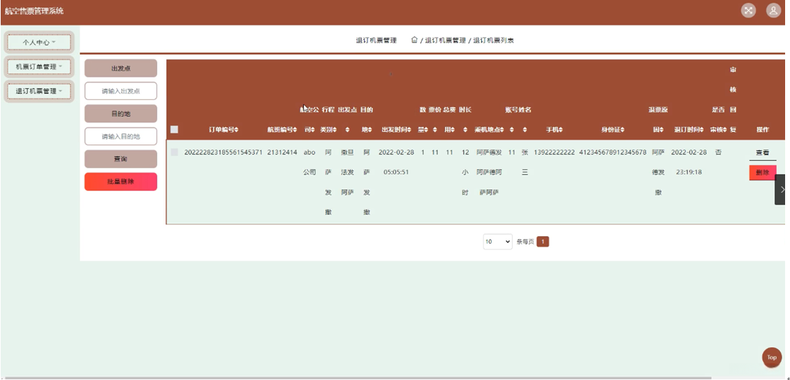 退订机票的相关管理,在该页面上允许用户浏览订单编号、航班编号、航空公司、行程类别、出发点、目的地、出发时间、数量、票价等信息,并执行编辑操作以浏览评论记录以及删除操作(如图5-13所示)。