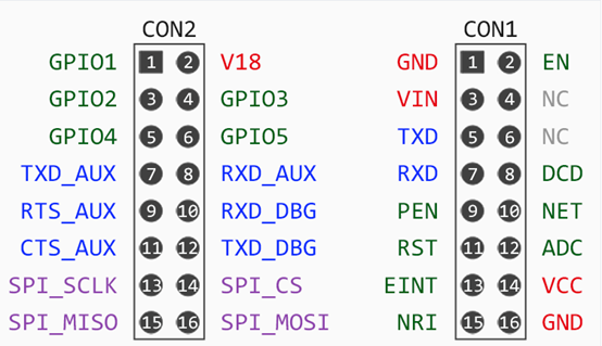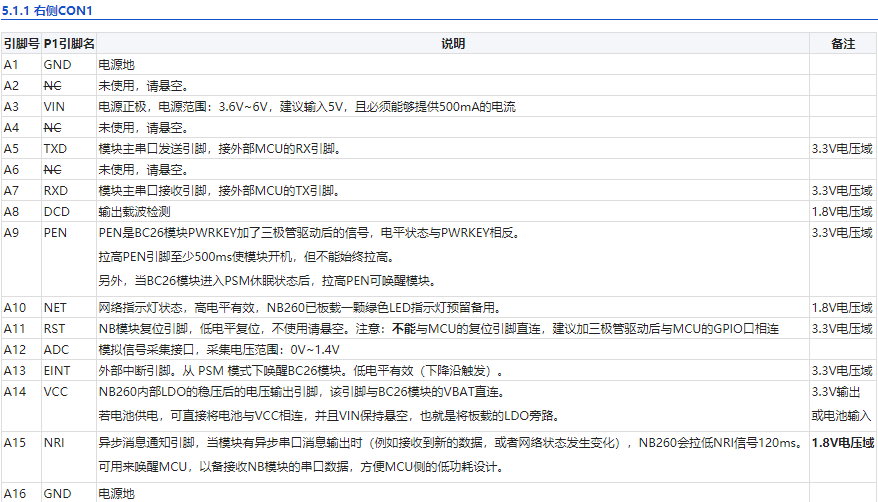 CON1(P1)左侧一列信号为:GND,VIN,TXD,RXD,PEN,RST,EINT,NRI(NRI电压域1.8V,若用作唤醒MCU,可以简单串联1K电阻然后上拉后与MCU的GPIO口相连。),该列信号还与NB101,NB200兼容,可以相互替换。