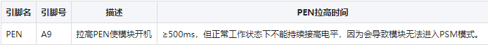 上电自启:解决模块上电不能自动启动,方法是持续拉高PEN,但后果是模块将不自动静茹PSM模式(省电睡眠模式)