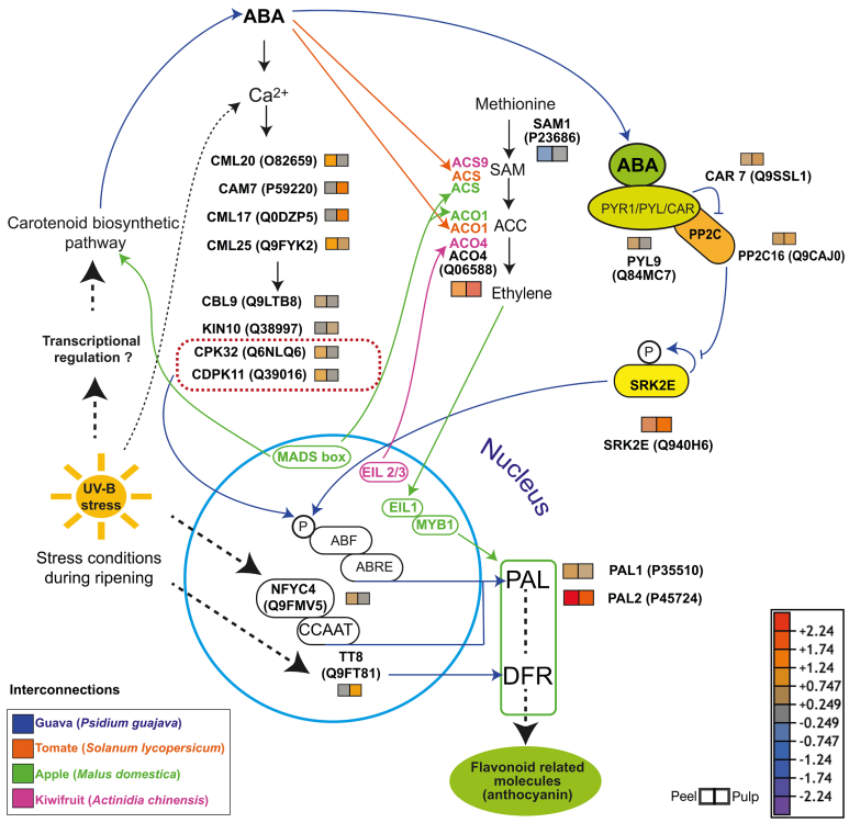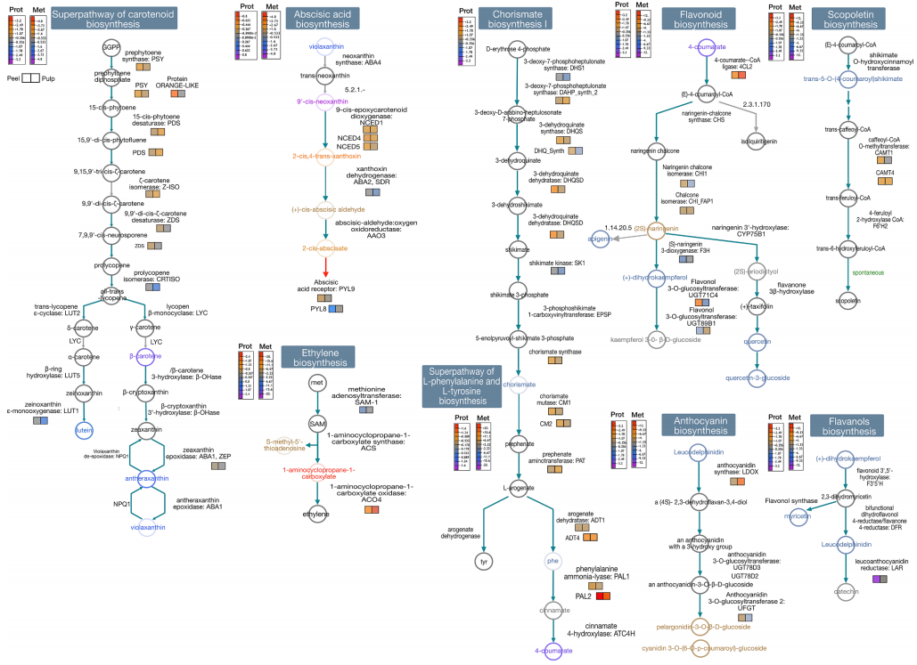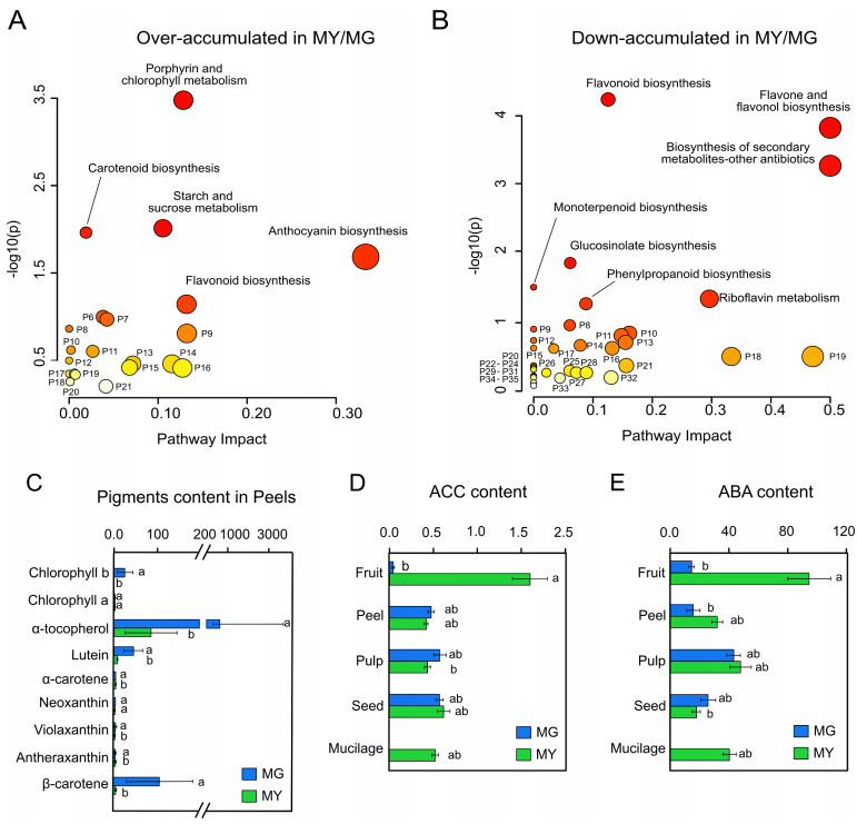 研究者利用蛋白质组学与代谢组学(含非靶标与靶标)的数据进行整合分析,并深入探究了乙烯、类胡萝卜素、ABA及酚类物质在番石榴成熟过程中所扮演的关键角色。研究结果表明:ACC(乙烯前体)及其相关酶ACO4的含量显著高于对照水平;在β-胡萝卜素、花药黄质及紫黄质等前体物质方面,其含量呈现出明显下降趋势;而脱落醛及脱落酸等后阶段代谢物却呈现出显著增加现象;此外,在MY样品中与酚类相关的酶系主要集中在果皮组织中(如分支酸生物合成调控酶),这一发现为后续研究提供了重要参考