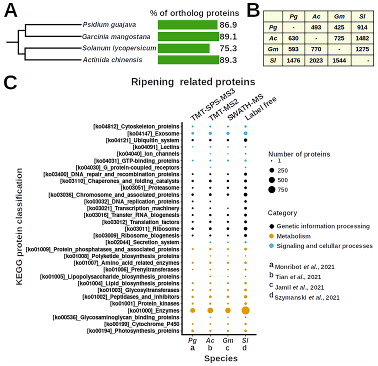 图2. 与山竹、猕猴桃和番茄中与成熟过程相关的差异累积蛋白质比较分析