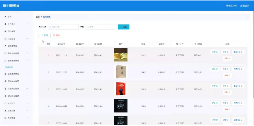 图书信息管理,在图书信息管理页面可以对图书编号,图书名称,图书分类,图片,作者,出版社,员工工号,员工姓名等内容进行详情,修改,查看评论和删除等操作,如图5-10所示。