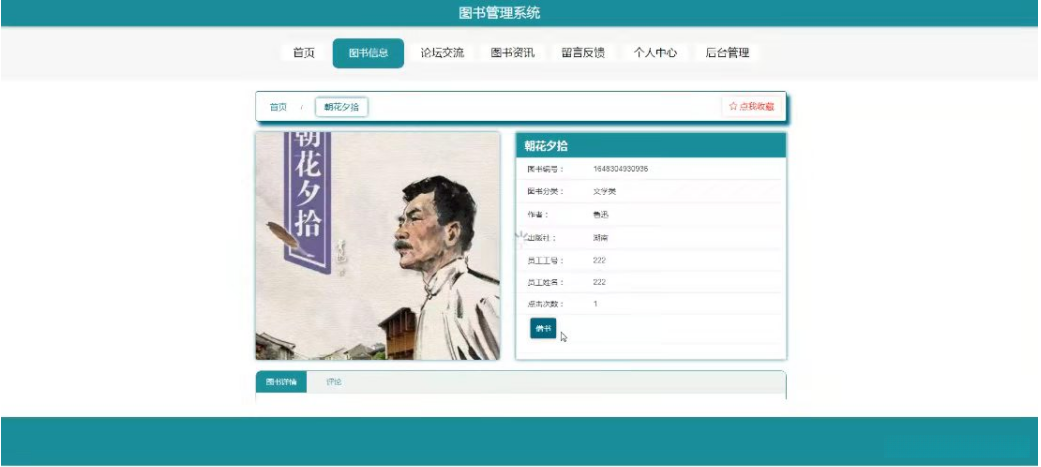 图书信息,在图书信息页面可以查看图书编号,图书分类,作者,出版社,员工工号,员工姓名,点击次数等详细内容,并进行收藏操作,如图5-2所示。