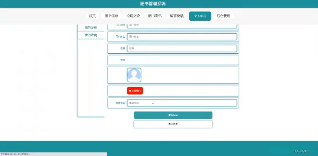 个人中心,在个人中心页面通过填写用户账号,用户姓名,密码,性别,电话号码等内容进行更新信息,根据需要对我的发布,我的收藏进行相对应操作,如图5-5所示。