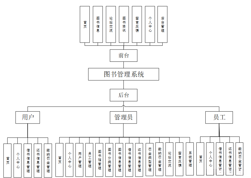 本图书管理系统提供管理员,用户和员工三个用户角色,主要包括首页,个人中心,用户管理,员工管理,图书管理,图书分类管理,图书信息管理,借书信息管理,还书信息管理,罚金类型管理,缴纳罚金管理,论坛交流,留言反馈,系统管理等功能。