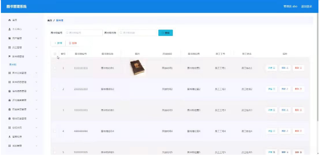 图书馆管理,在图书馆管理页面可以对图书馆编号,图书馆名称,图片,开放时间,图书馆位置,员工工号,员工姓名内容进行详情,修改和删除等操作,如图5-9所示。