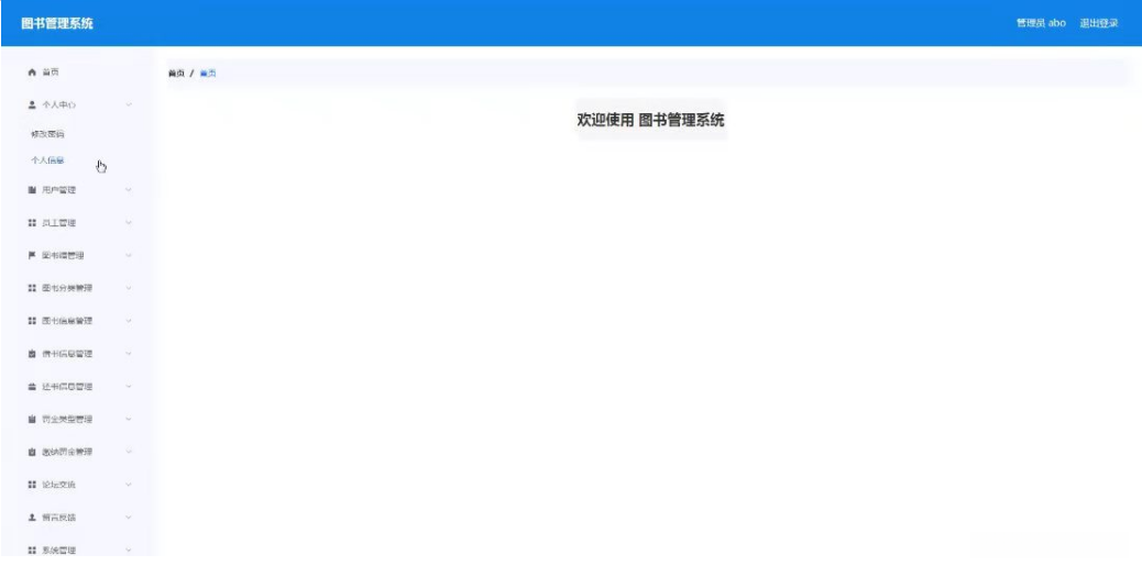 管理员登录系统后,可以对首页,个人中心,用户管理,员工管理,图书管理,图书分类管理,图书信息管理,借书信息管理,还书信息管理,罚金类型管理,缴纳罚金管理,论坛交流,留言反馈,系统管理等功能进行相应的操作管理,如图5-7所示。