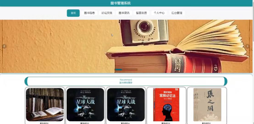 图书管理系统,在系统首页可以查看首页,图书信息,论坛交流,图书咨询,留言反馈,个人中心,后台管理等内容进行详细操作,如图5-1所示。