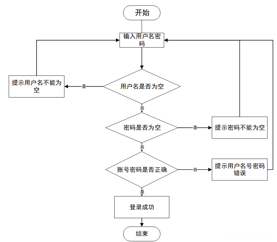 运行流程主要为输入用户名密码,并且不能为空,若为空则提示不能为空,用户名和密码全部输对即可登入成功,主要流程如图3-2。