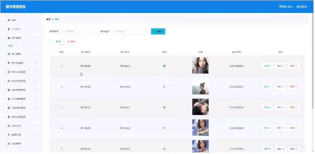 用户管理,在用户管理页面可以对用户账号,用户姓名,性别,头像,电话号码等内容进行详情,修改和删除等操作,如图5-8所示。