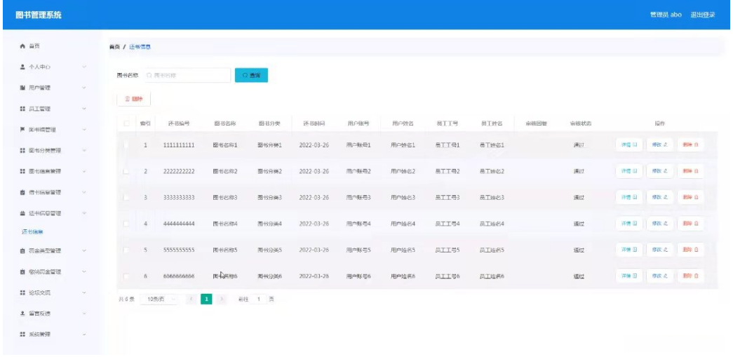还书信息管理,在还书信息管理页面可以对还书编号,图书名称,图书分类,还书时间,用户账号,用户姓名,员工工号,员工姓名,审核回复,审核状态等内容进行详情,修改和删除等操作,如图5-12所示。
