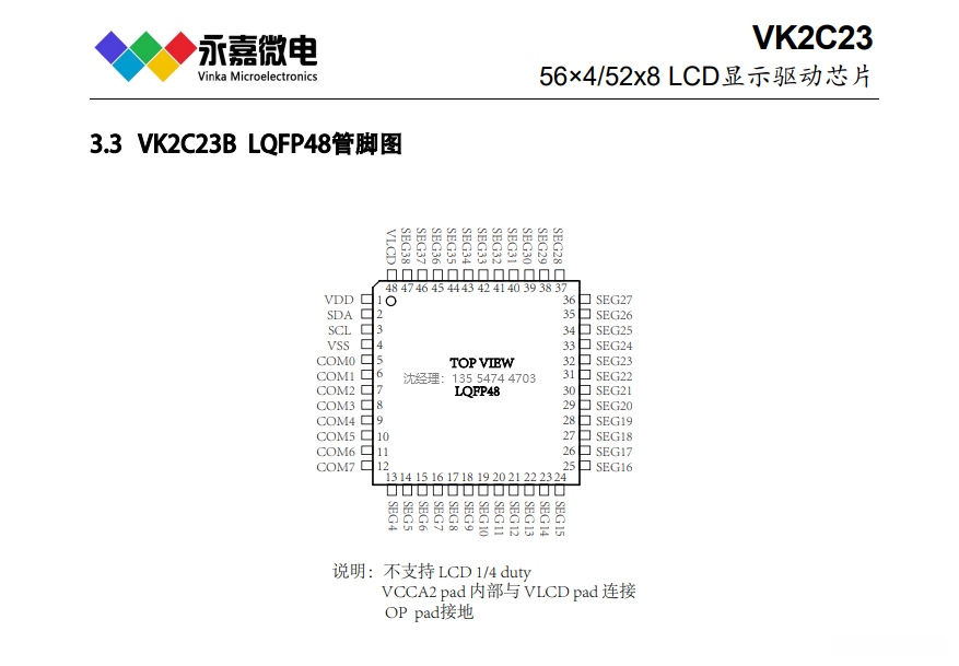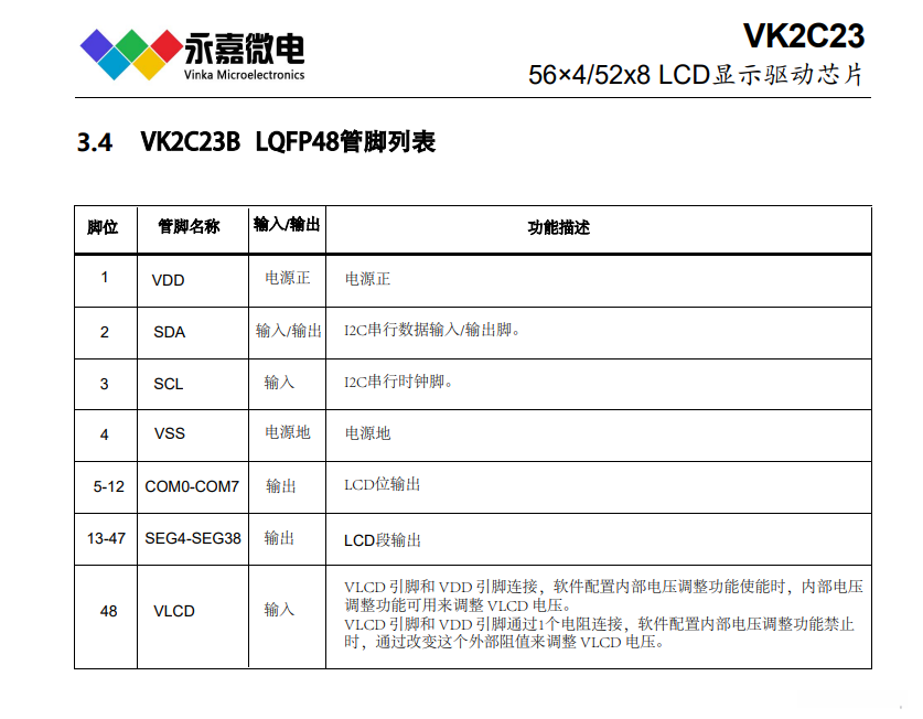 VK2C23B型号具有如下特性:工作电压范围为2.4至5.5V;引脚数量与通道数分别为36段及8通道;分别取其1/3和1/4的偏置电压设置;支持I2C通讯接口;LQFP48封装类型;DICE/DIE裸片(封装)采用COB封装技术,并且其中DICE裸线与DIE导体进行电连接;COG(绑定玻璃)则提供了高抗干扰、抗噪声以及低功耗三项性能保障