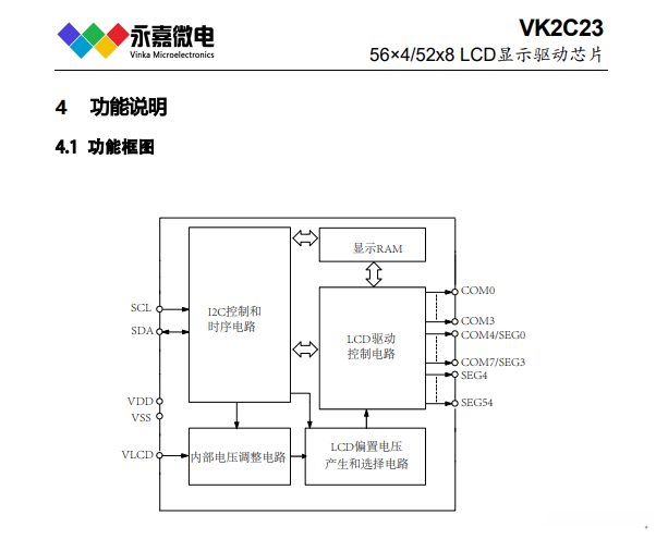 VK2C23是一种基于点阵式存储映射设计的LCD控制器芯片,能够支持最大分辨率达56SEG×4COM(总计224个像素)或52SEG×8COM(总计416个像素)的标准LCD面板。单片机可通过I2C总线接口设置显示参数并发送读写显示数据指令;此外还支持进入节能模式操作。该控制器具有优异的抗干扰性能和低功耗特点,在水、电、气表及工业控制仪表等设备中均可见到其身影。L34+44