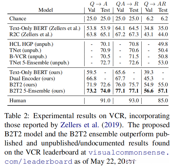我们的双编码器模型工作得非常好,超过没有使用边界框的基线。我们还评估了一个仅限文本的基线,它类似于双编码器模型,但忽略了图像。与Q→A、QA→R和Q→AR任务的已发布的R2C基线相比,其绝对准确率分别提高了8.9%、9.8%和13.1%。我们的单个B2T2和集成B2T2模型都优于VCR排行榜上的所有其他系统。